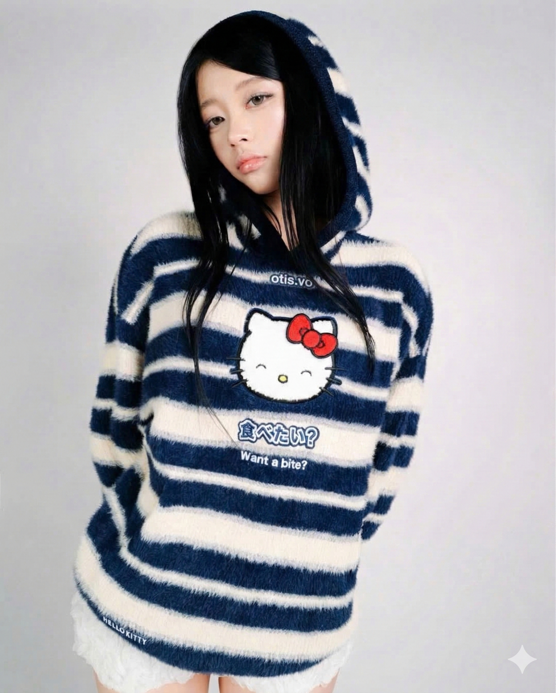 Điểm nhấn: Hình thêu Hello Kitty lớn ở chính giữa cùng dòng chữ tiếng Nhật “食べたい?” và tiếng Anh “Want a bite?”.